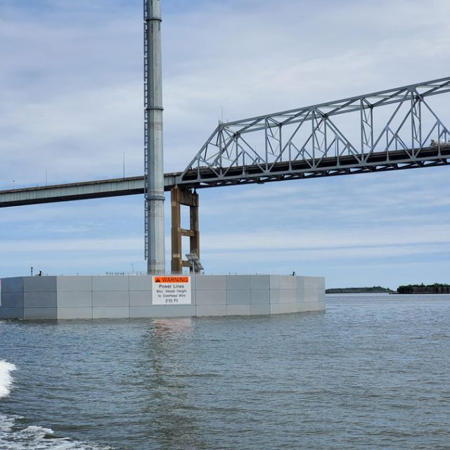 BGE had two high-voltage underwater transmission cables crossing the Patapsco River that were reaching the end of their useful life. The underwater cables were approximately two miles long and a decision was made to replace them with an overhead transmission line. The two-mile overhead line required five monopole structures in the river posing a potential danger to shipping and air traffic.